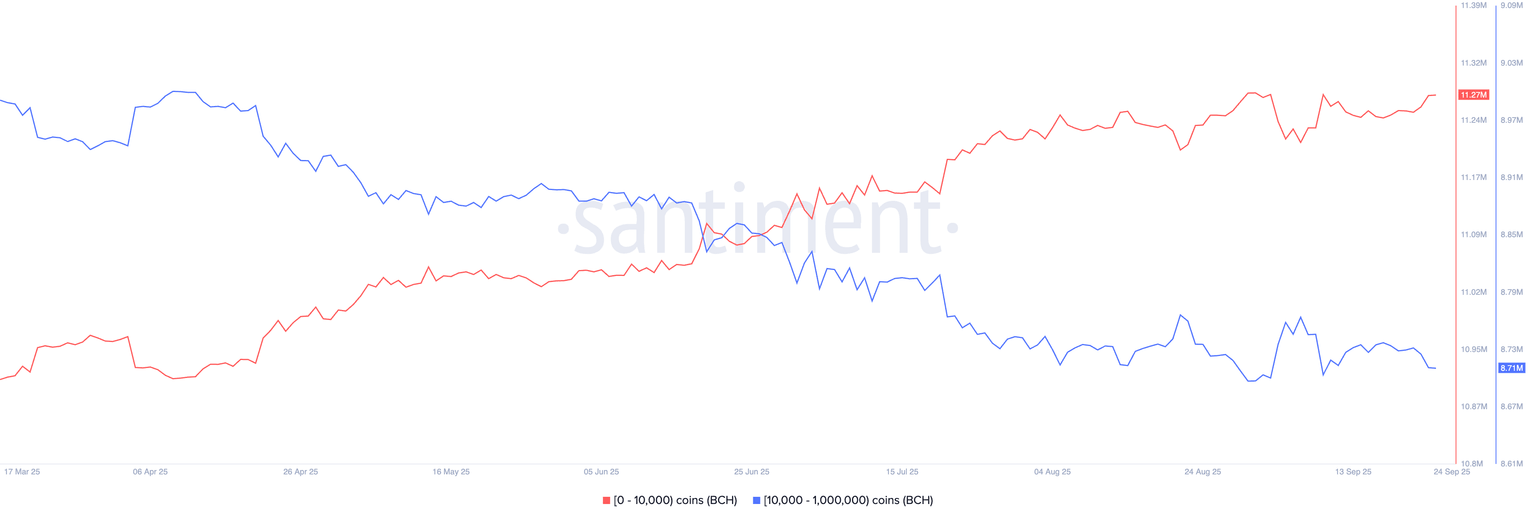 Santiment data shows a drift developing between retail and large wallet investors based on the Bitcoin Cash supply distribution. Investors with less than 10,000 BCH continue the accumulation spree, reaching a total holding of 11.27 million BCH.