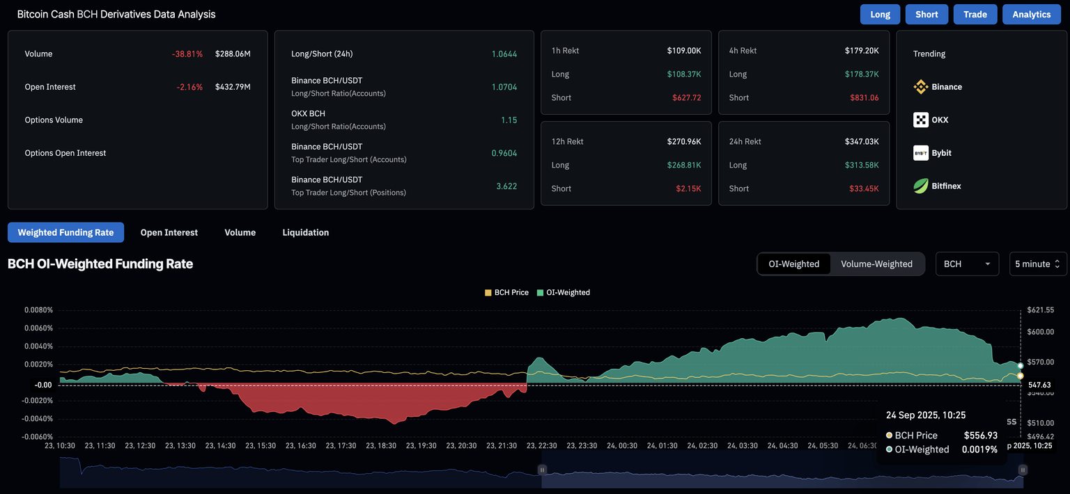 Adding to the downside, CoinGlass data reveals that the Bitcoin Cash Open Interest (OI) has declined by 2.16% in the last 24 hours, reaching $432.79 million. This significant capital outflow from BCH derivatives suggests that traders are exiting either due to forced liquidation or a decline in confidence.
