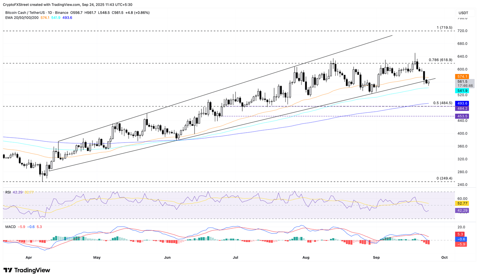 Bitcoin Cash holds above the 100-period Exponential Moving Average (EMA) at $541, rising after five days of downtrend and breaking down an expanding channel on the daily chart. Despite the short-term rise, momentum indicators on the same chart reflect that the bearish momentum remains prominent.