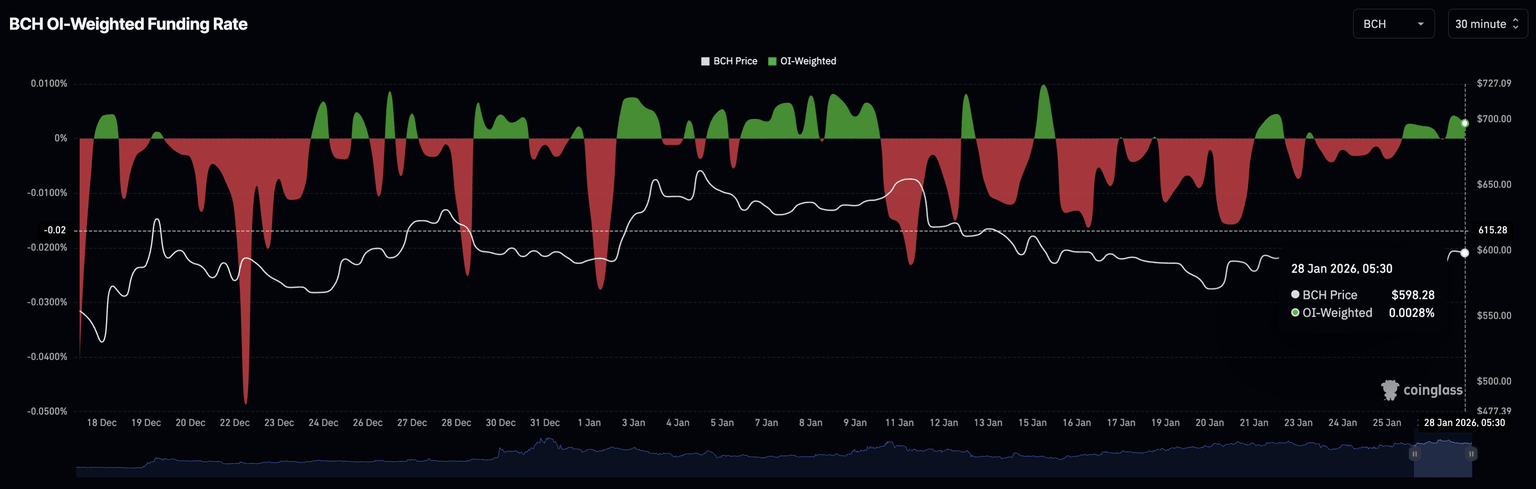 Bitcoin Cash (BCH) is trading around $600 at press time on Wednesday, framing a potential double bottom reversal on the daily chart. The BCH token is witnessing renewed capital inflows into its futures contracts amid a positive funding rate cycle, signaling renewed investor interest. Technically, Bitcoin Cash could rally toward $655 if it sustains momentum.