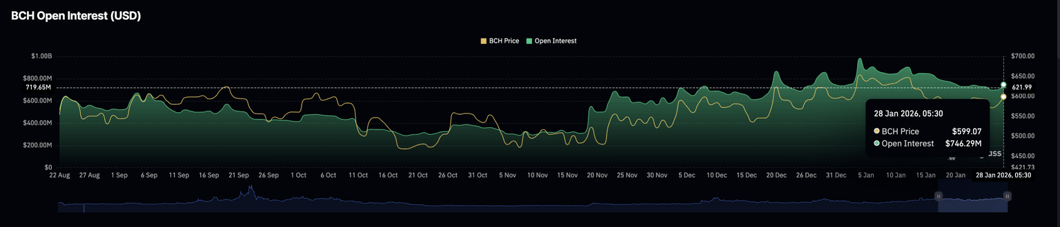 Bitcoin Cash witnesses early signs of retail engagement, aligning with the recovery run seen so far this week. Typically, an alignment of positive funding rates and OI spike signals further upside for an asset. CoinGlass data shows a spike in BCH futures Open Interest (OI) to $746.29 million, up from $700.06 million on Tuesday, indicating increased risk exposure as investors anticipate further gains.