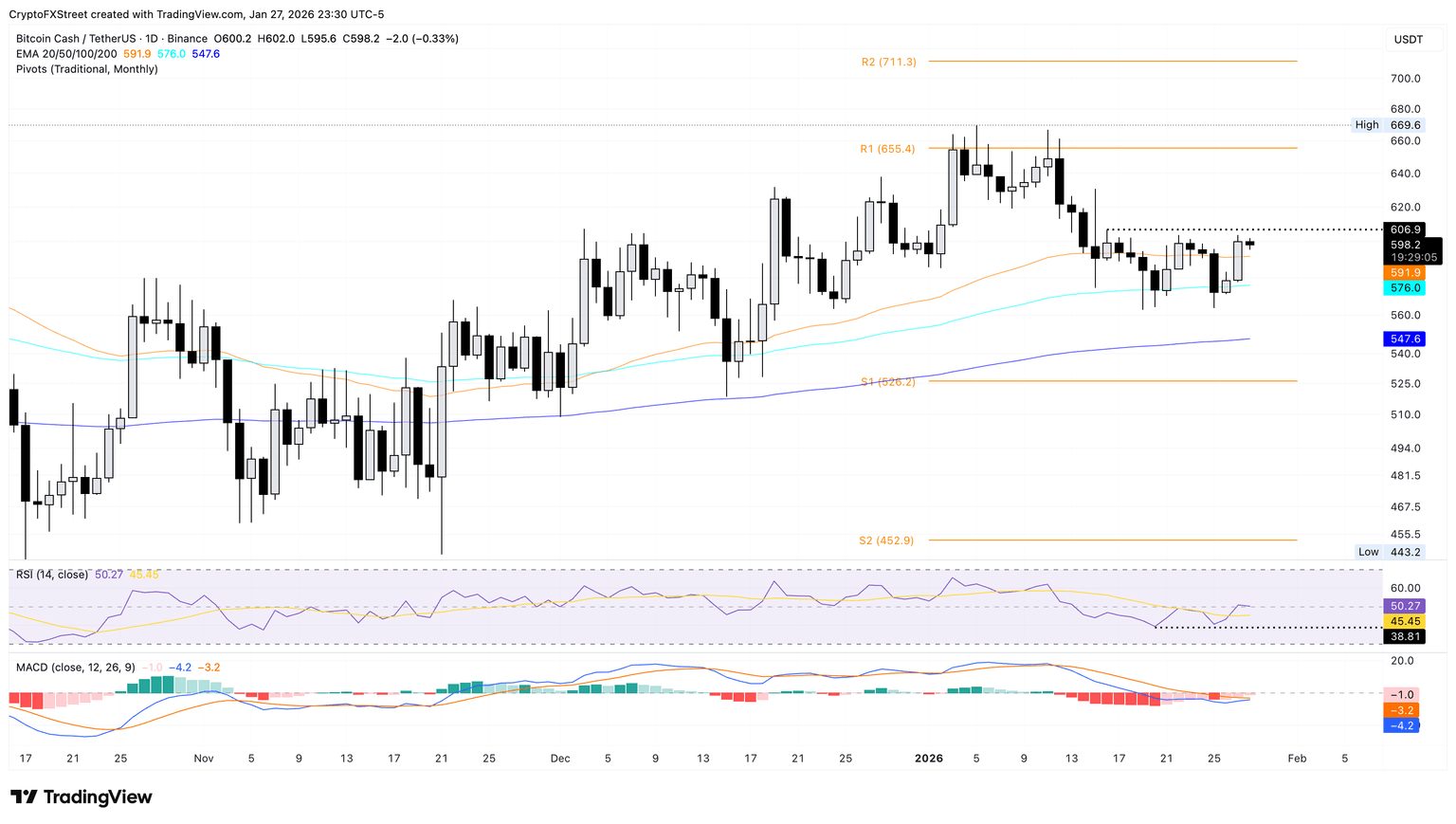 Bitcoin Cash is trading around $600, holding above the 50-day Exponential Moving Average (EMA), which is now above the 100-day and 200-day EMAs, suggesting a long-term uptrend. The rebounds from the 100-day EMA at $575 form a double bottom pattern on the BCH daily price chart with the neckline at the January 16 high of $606.