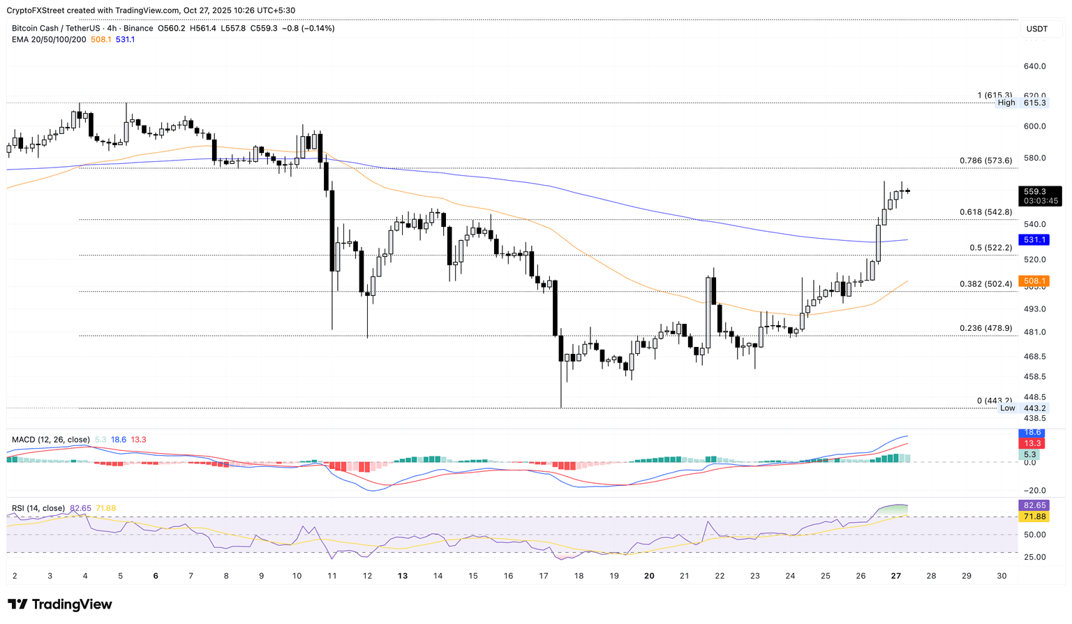 As the whales' interest grows, a successful push above $573 could extend the BCH rally to the $615 peak from October 3.