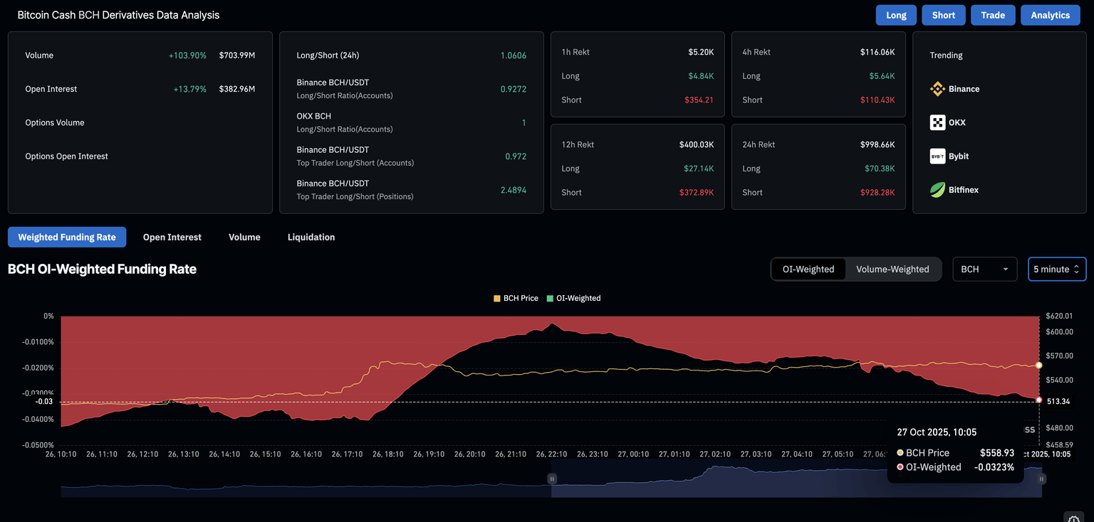 In line with high demand, CoinGlass data shows a 13.8% increase in BCH futures Open Interest (OI) over the last 24 hours, bringing it to $382.96 million. An increase in futures OI suggests risk-on sentiment among traders as the notional value of outstanding long positions increases.