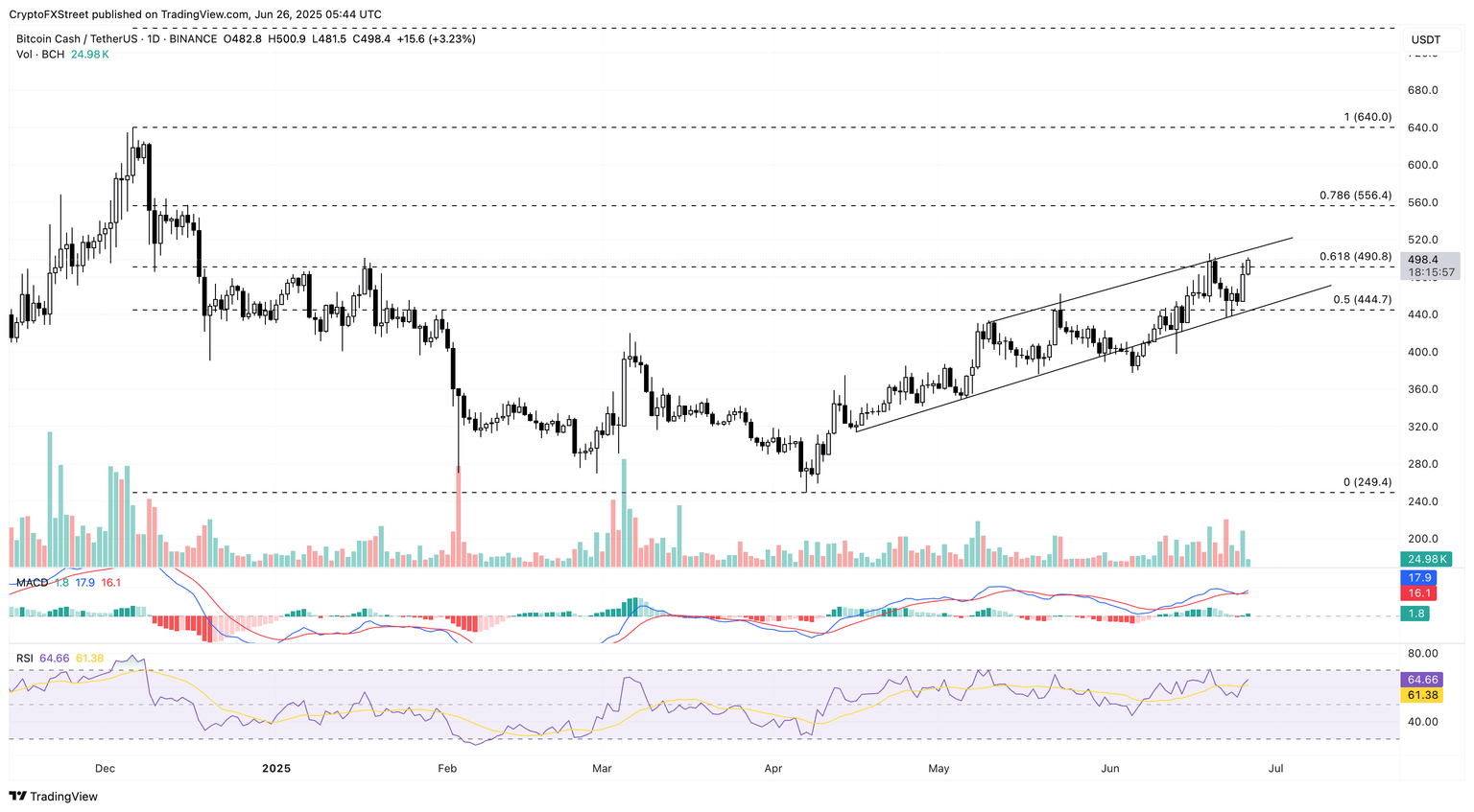 If Bitcoin Cash fails to close above the 61.8% Fibonacci level at $490, it could retest the rising channel’s lower boundary line at $450.