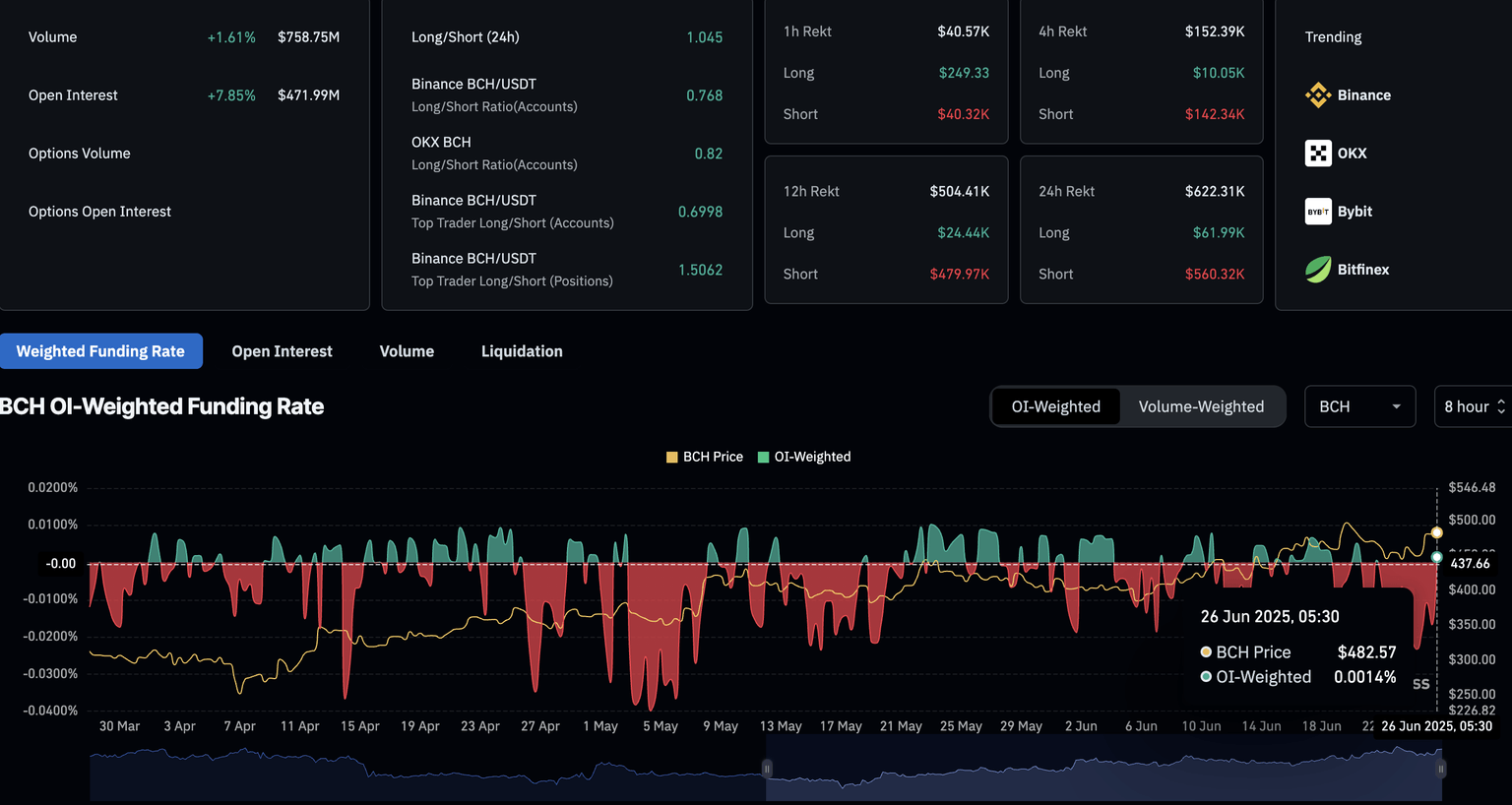 CoinGlass’s data shows that Bitcoin Cash Open Interest (OI) reached $471.99 million, with a 7.85% increase in the last 24 hours. An OI spike refers to an increase in funds inflow in the derivatives market resulting from excessive buying activity.