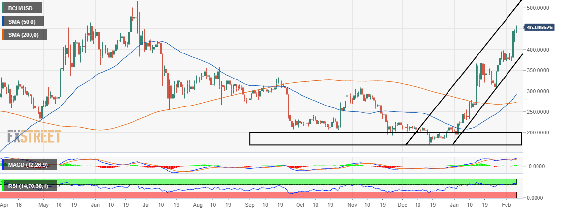 Bitcoin Cash is starting the trading in the green for two days in a row. The bullish action follows a retracement from the previous January high at $403. BCH broke down to levels marginally beneath $300. However, the losses encountered overwhelming buying pressure, which pushed the price significantly above $400 to the extent of settling above $450.