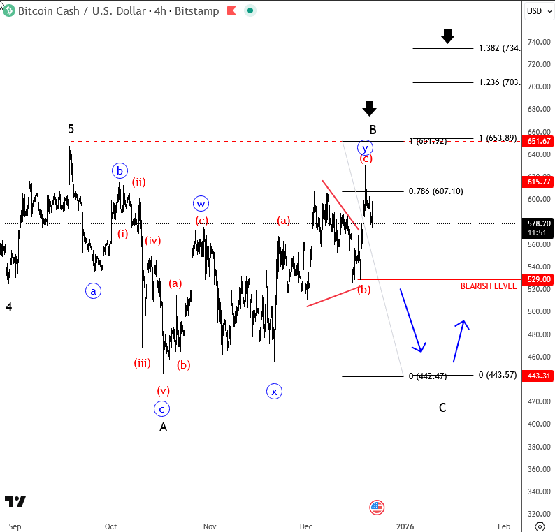 Bitcoin Cash has seen a nice recovery over the last two months of more than 40%, but notice that the move from 443 is still clearly overlapping, so it can still be wave B as part of a larger A-B-C correction, with a flat also a possible scenario. This means we should be aware of limited upside and a potential reversal lower, possibly even from current levels. Especially if price drops below the 529 level, there is a real chance the market will retest the lower side of the September–October range.