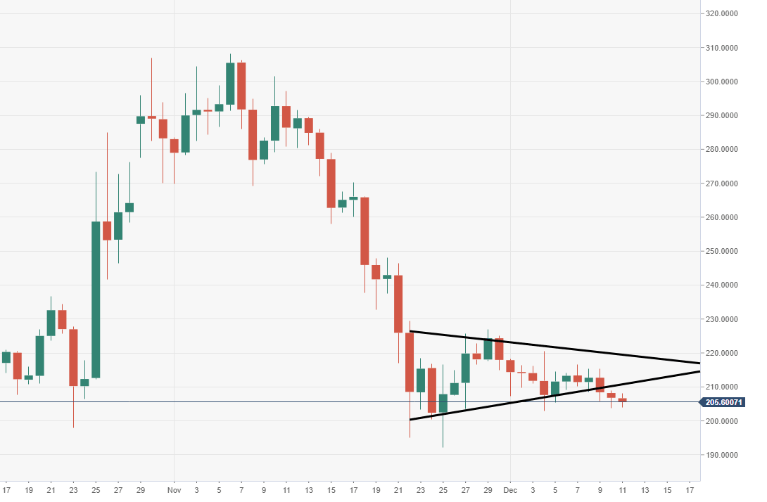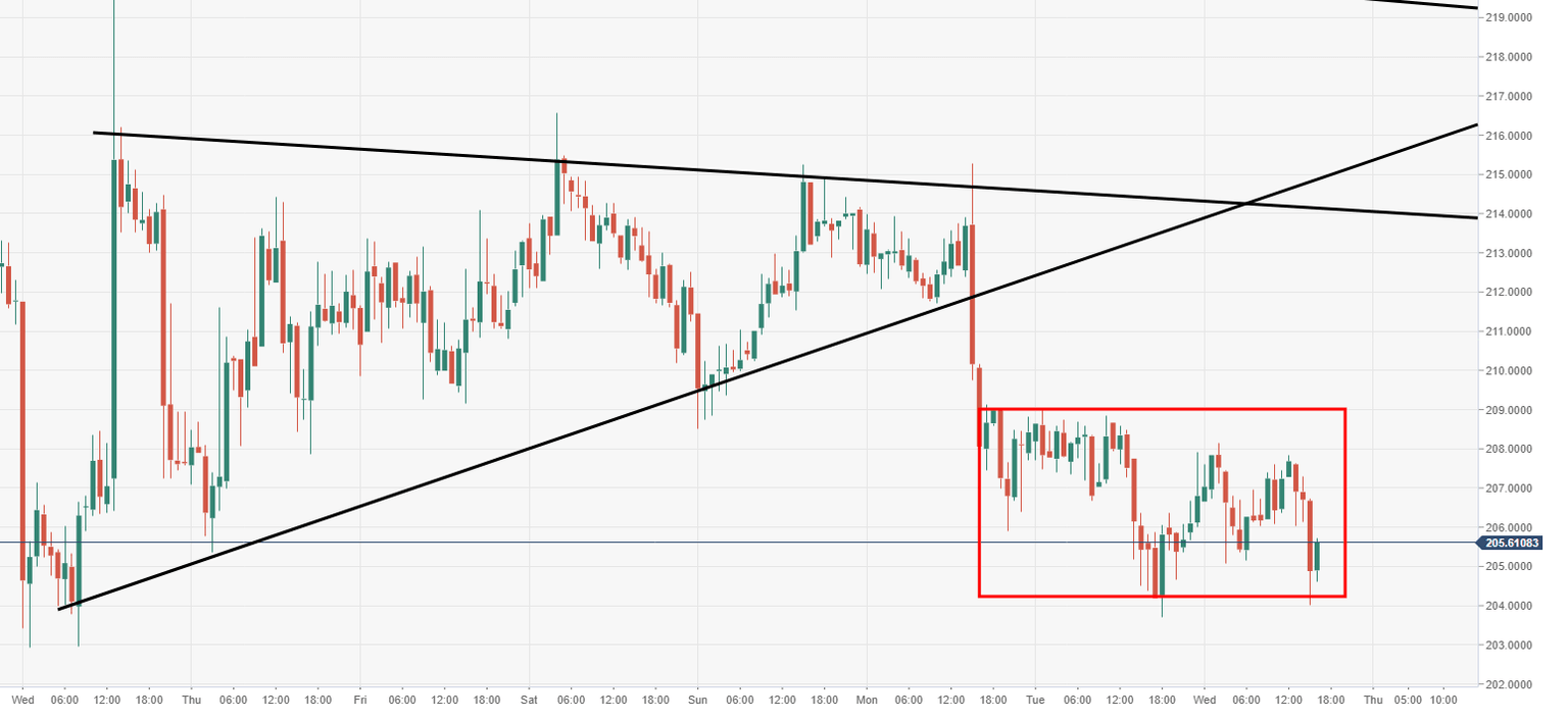 Near-term price action is consolidating, a high up at $209 with support at $204, $5 range, ahead of next committed move.