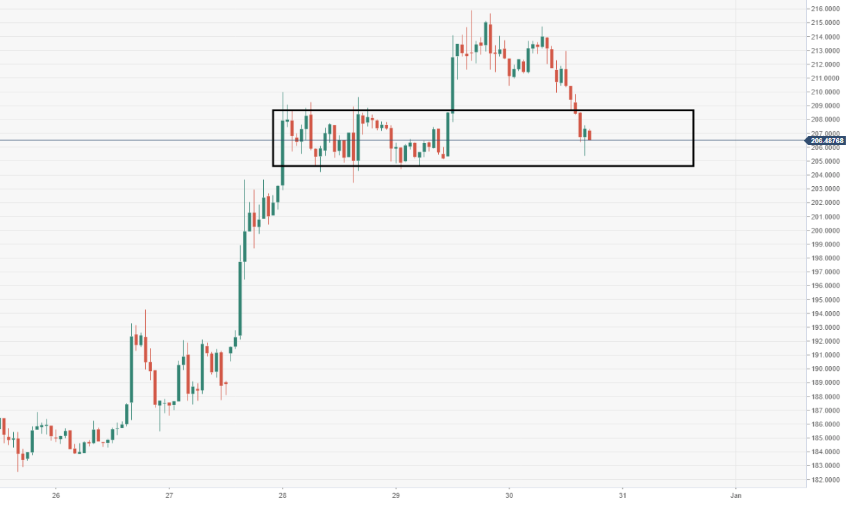 The price is getting sucked back within a breached 60-minute range, with the $200 mark at risk of another retest.