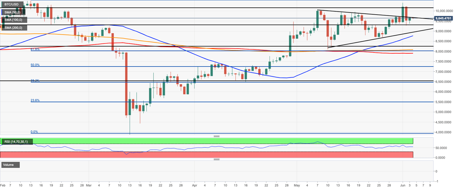 Bitcoin returned inside the previously broken triangle pattern. Now the coin stays close to its upper boundary. If it is broken, the upside momentum will gain traction with the next focus on $10,000. However, we may see a retreat towards the lower line of the recent range of $9,400 before another bullish leg. The critical support is created by psychological $9,000 which is strengthened by the lower boundary of the triangle pattern.