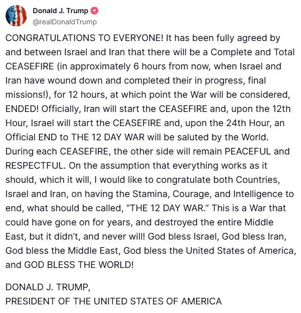 President Trump announced that Israel and Iran have agreed to a full ceasefire set to begin within a few hours, potentially ending what he referred to as "The 12 Day War," according to a Monday post on the social media platform Truth Social.