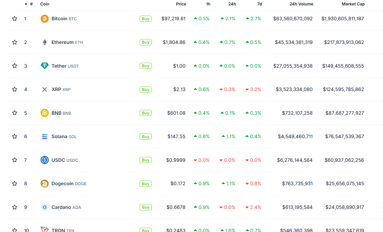 Bitcoin traded above $97,000 on Wednesday, maintaining a 2% gain as the crypto market remained unfazed following the Fed's decision. Other top assets, Ethereum (ETH), XRP, Solana (SOL) and Dogecoin (DOGE), also held steady with little price changes.
