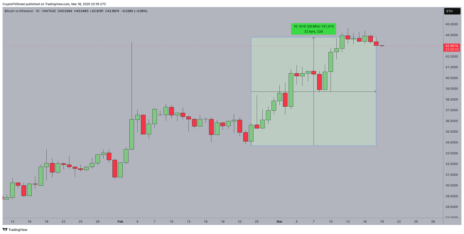 With both assets trading at $81,000 and $1,800 respectively, this implies that 1 BTC can currently purchase over 44 ETH, up 30% from the 1:33 ratio observed at recent lows on February 25.