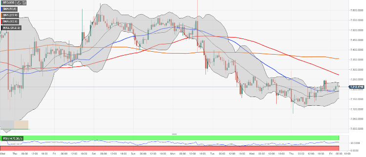 On the intraday charts, BTC/USD bottomed at $7,076 and recovered to $7,213 by press time. However, the upside momentum has faded away on approach to strong resistance area created by 61.8% Fibo retracement and the upper line of 1-hour Bollinger Band.