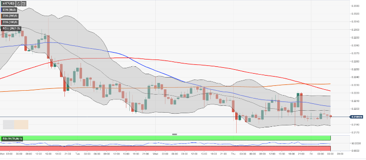 Ripple's XRP slipped below $0.2200 again. The third-largest coin has been moving to and fro around this pivotal level for over two weeks with no clear direction. The initial support is created by the lower line of the 1-hour Bollinger Band at $0.2179; the resistance lies at $0.2230.