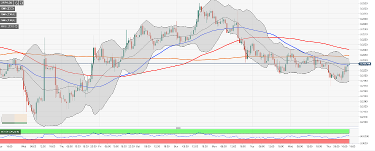 Ripple's XRP has settled above $0.2200 after a move towards $0.2169 during early Asian hours. The coin has recovered the intraday losses, though it is still locked within the downside trend. The upside may be limited by SMA200 1-hour at $0.2230.