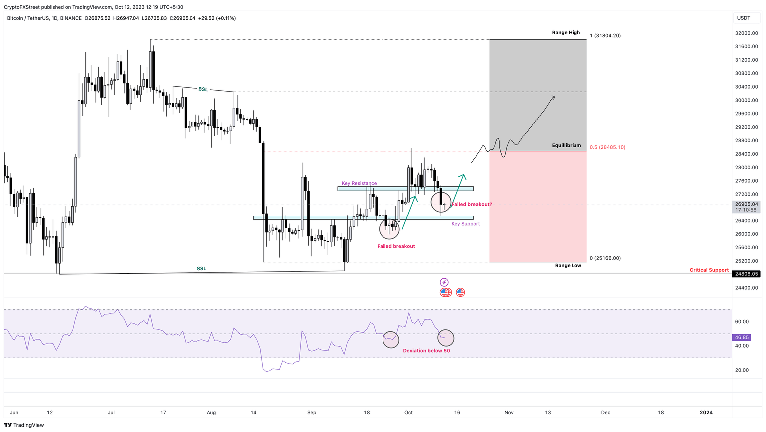 On the flip side, the position of the Relative Strength Index (RSI) below 50 suggests a continued slump that could see Bitcoin price break below the key support extending from $26,400 and $26,500. A break and close below this level could send BTC to the depths of the $26,000 psychological level. In the dire case, the losses could extrapolate to the bottom of the market range at around $25,166.