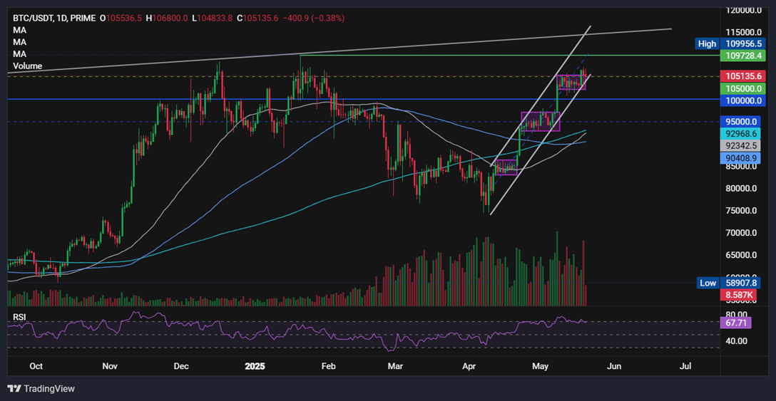 Bitcoin trades within a rising channel dating back to its 74.5k April low. The price is consolidating within that channel around the 105k level. This marks the third consolidation event, 85k, 95k, 105k, each occurring around every 10k. The consolidation could continue in the near term to bring the RSI out of oversold territory.