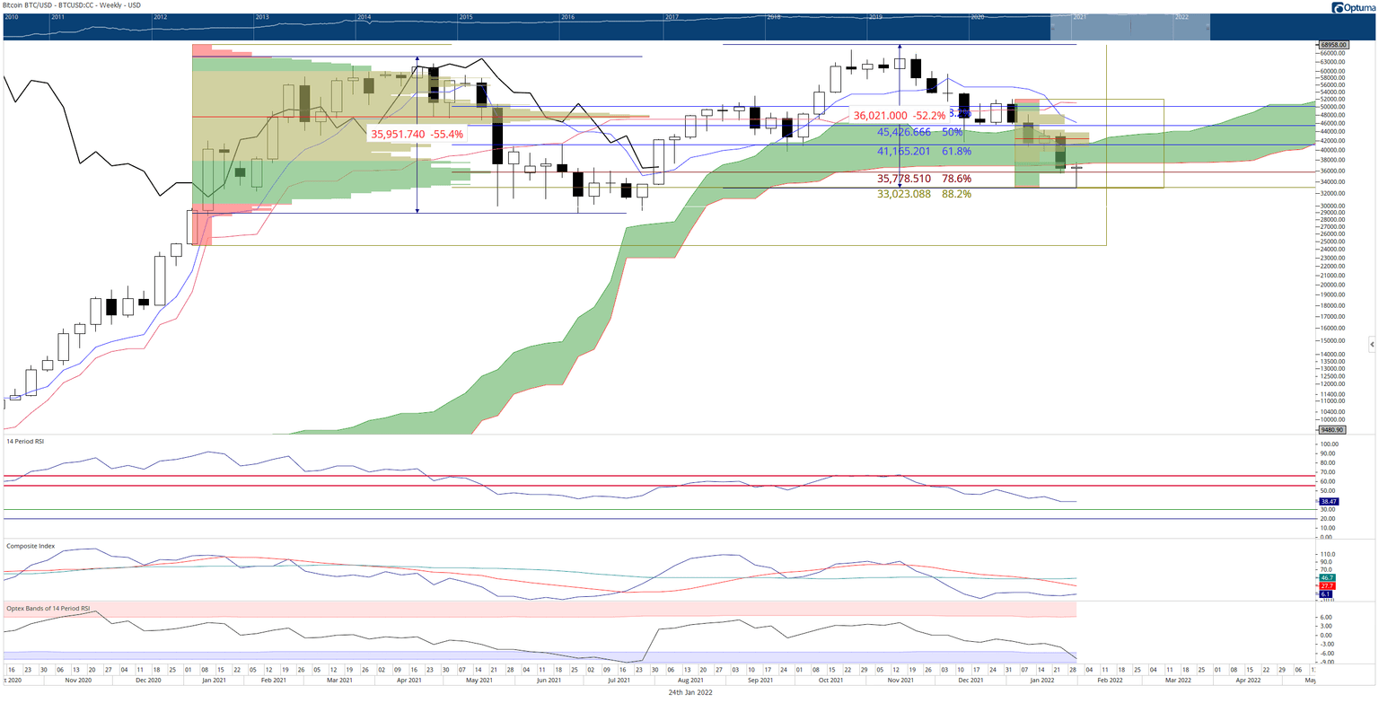 When Bitcoin price hit the 88.2% Fibonacci retracement, it immediately reversed Bitcoin's direction. From an oscillator perspective, Bitcoin is neutral in the Relative Strength Index but severely oversold in the Optex Band oscillator. This is the first time Bitcoin has hit the weekly oversold level in the Optex Bands oscillator since July 2021 – which preceded a move to new all-time highs.