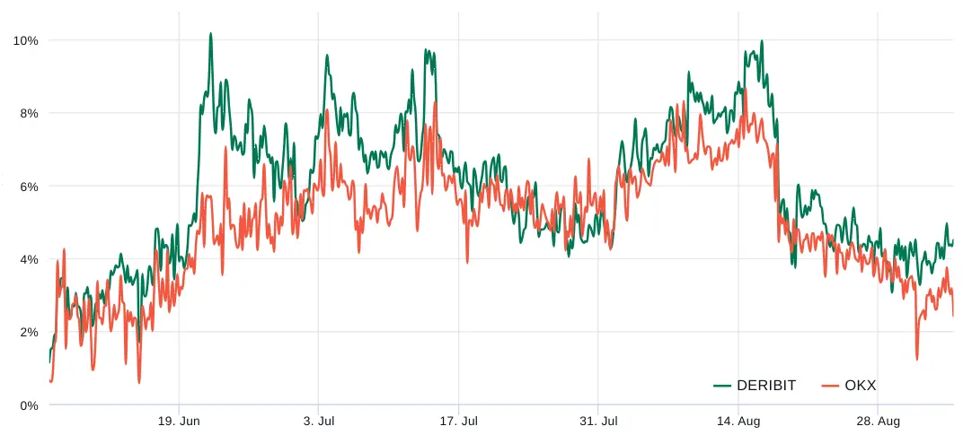As displayed above, the options’ 25% delta skew has recently entered bearish territory, with protective put (sell) options trading at a 9% premium on Sept. 4 compared with similar call (buy) options.