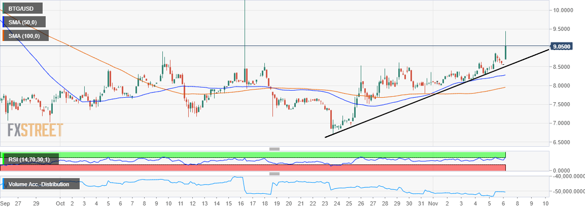Meanwhile, in the event of a reversal, likely to be signaled by the RSI retreat towards 50, BTG could find support at $8.50, the 50 SMA on the four-hour chart and the 100 SMA slightly below $8.0. An ascending trendline is also in line to offer support