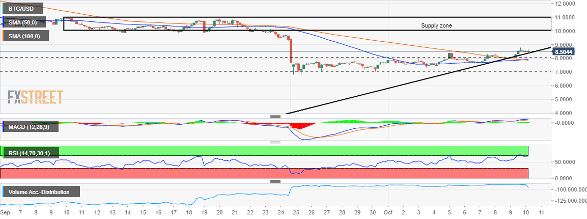 On the other hand, BTG/USD is defying the general downtrend with a 2.33% increase in value. The enthusiastic move comes after roughly two weeks of consolidation between $7and $8. The initial break above the Simple Moving Averages (SMAs) gave the price a kick towards $10 (supply zone).