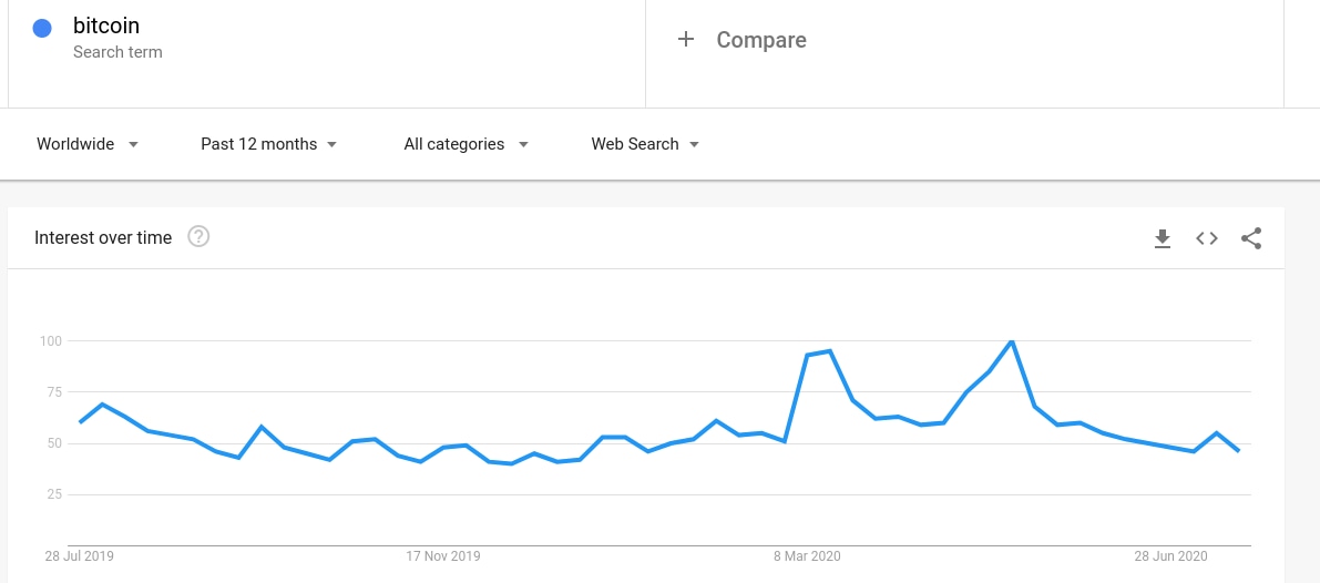 That price spike caused a modest uptick in search interest to 62, but it was the March coronavirus crash which formed the standout event among Google searches. May’s block subsidy halving produced similar effects.