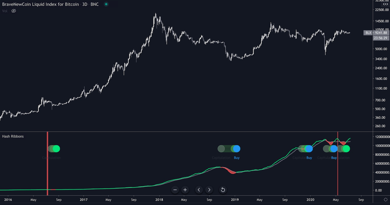 The basic theory of the Hash Ribbon indicator is that the Bitcoin market tends to reach a bottom when miners capitulate.
