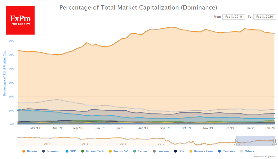 Bitcoin showed minimal fluctuations during the weekend, while altcoins moved up confidently. The dominance index dropped to 65.3%, fall short of a few percents to December 2017 levels: the time when the altcoin season began, marking the start of the decline in the BTC Dominance index to 33%.