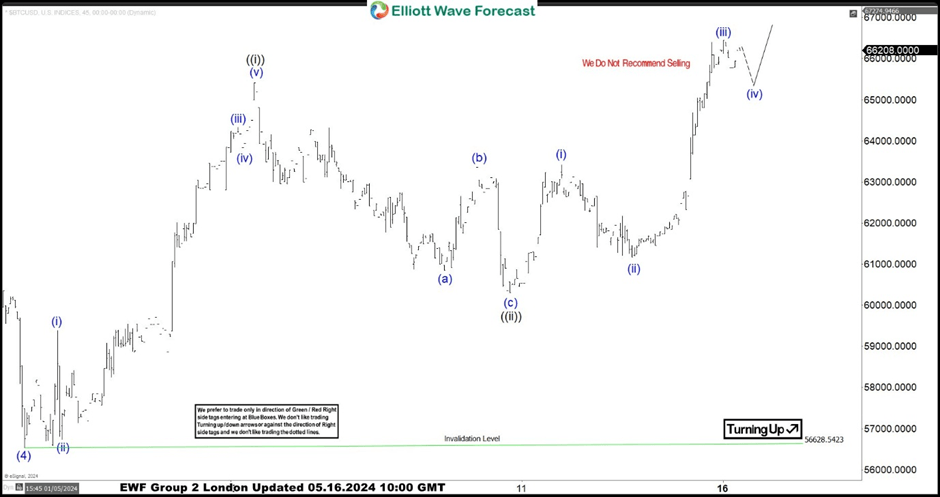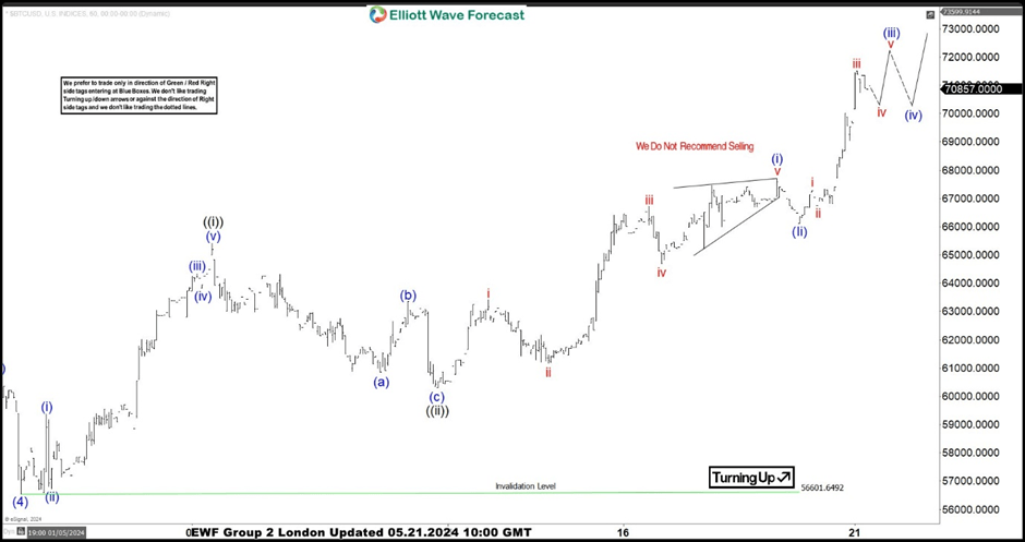 In this technical article we’re going to take a quick look at the Elliott Wave chartsof Bitcoin (BTC/USD). Bitcoin is showing impulsive bullish sequences in the cycle from the 25068 low. BTC/USD ended wave (4) correction at the 56628 . Now, the crypto is showing impulsive bullish sequences in the cycle from the May 1st low. Consequently we expected more strength in short term. In further text we are going to explain wave forecast.