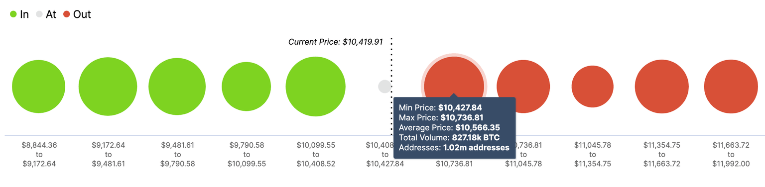 IntoTheBlock's "In/Out of the Money Around Price" (IOMAP) model reveals there is a big supply above the current price that may prevent BTC from achieving its upside potential. Based on this on-chain metric, the area between $10,400 and $10,700 is filled by many investors who had previously purchased BTC around this price level. Here, roughly 1 million addresses are holding nearly 827,000 BTC.