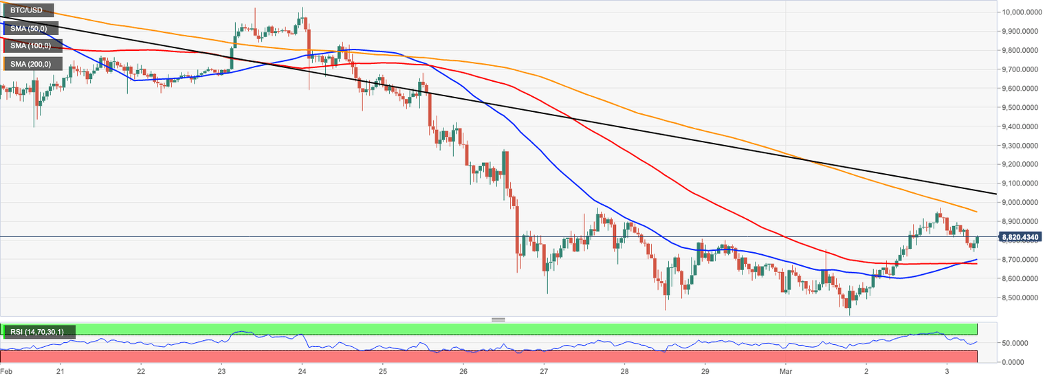 BTC/USD is hovering around $8,800, down from Monday's low registered at $8,974. The first digital asset came close to the critical resistance of $9,000 but reversed back inside the range as the upside momentum faded away on approach to the significant technical level. BTC has bee range-bound with a bearish bias on Tuesday, down 1.5% since the beginning of the day.