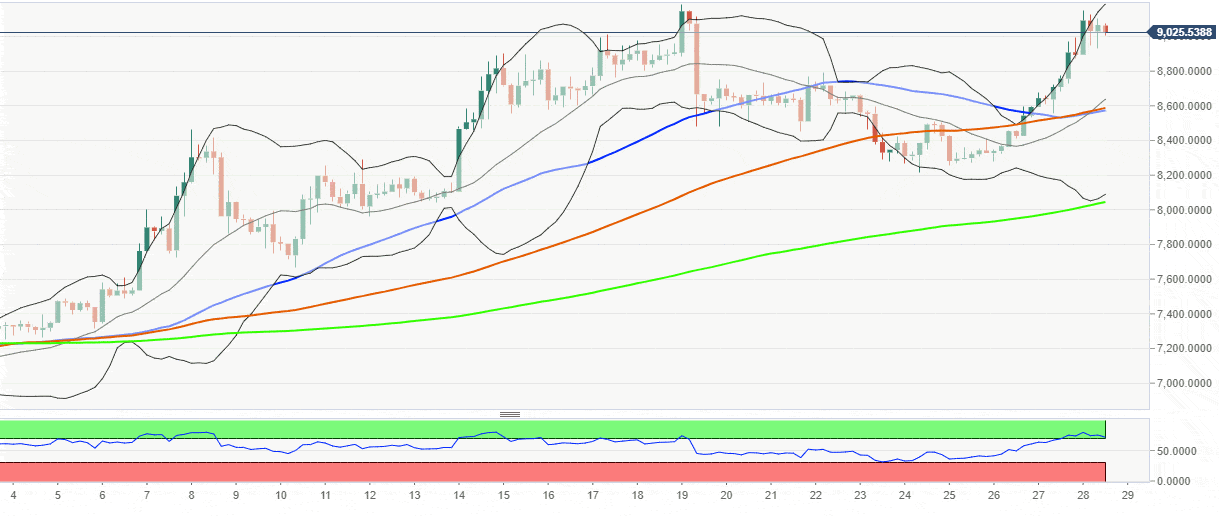 On the downside, a retreat back below $9,000 will push the price mack inside the recent range with the initial support at $8,600, reinforced by the middle line of the daily Bollinger Band. It is closely followed by $8,450 (50% Fibo retracement). The critical support comes at $8,000 with SMA100 daily and SMA50 weekly located around that area.