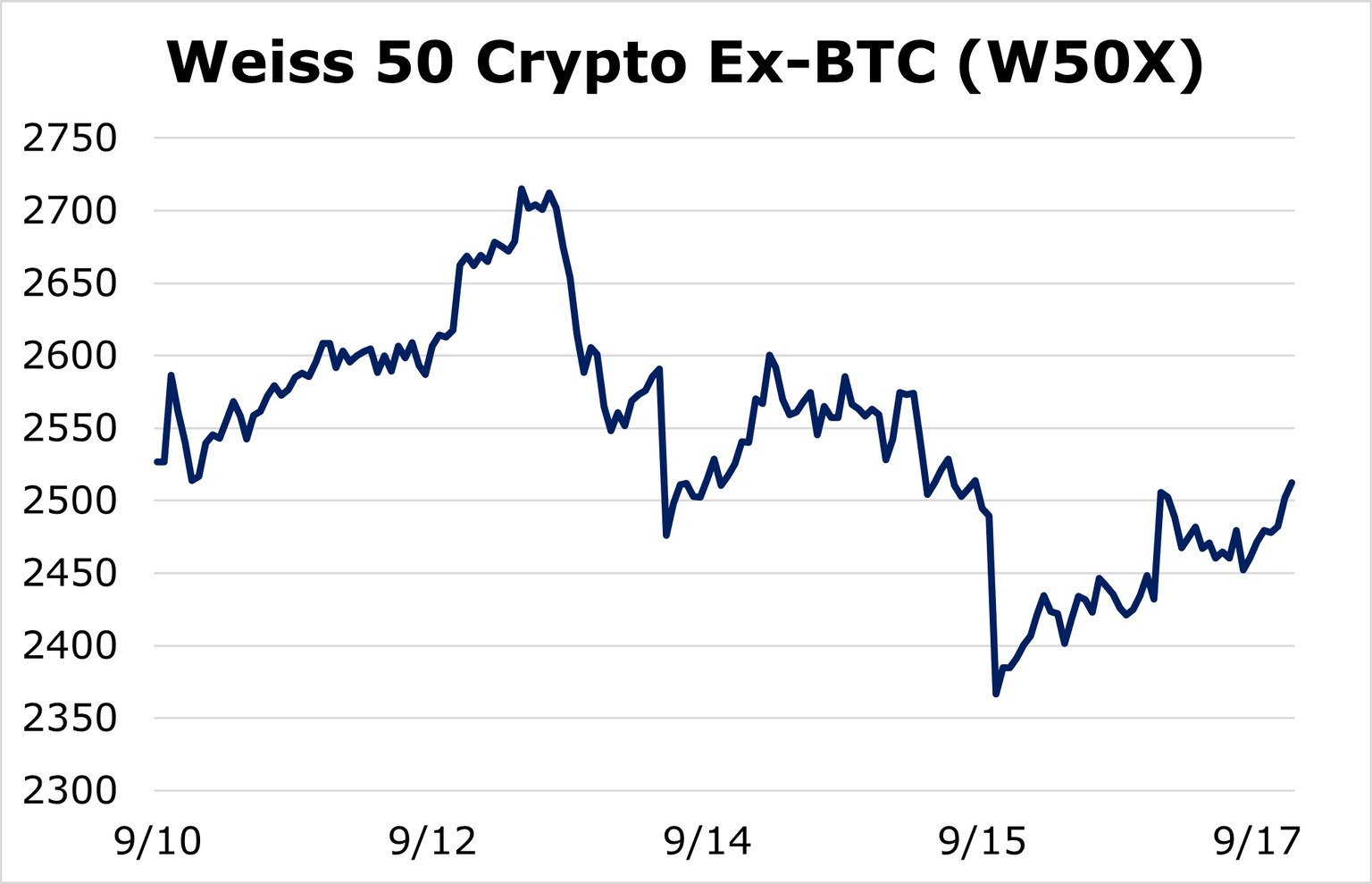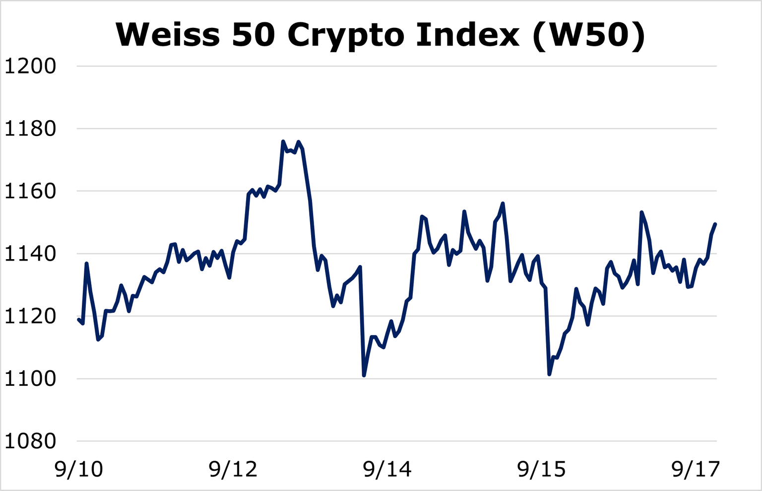 The Weiss 50 Crypto Index (W50), the broadest measure of the industry, closed the seven-day trading week ended Thursday Sept. 17, with a 2.73% gain. As the chart below shows, it was basically a “sideways” week ...