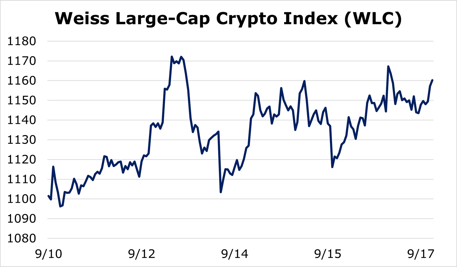 The Weiss Large Cap Crypto Index (WLC) — which is dominated by Bitcoin — moved up 5.34% on the week. Note also that, despite some ups and downs, this index spent most of the week heading higher ...