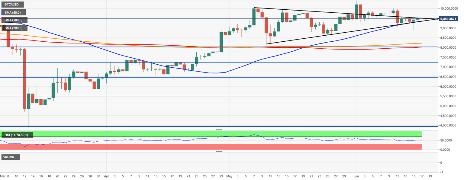 - BTC/USD is trapped inside the triangle pattern, hovering around $9,500.