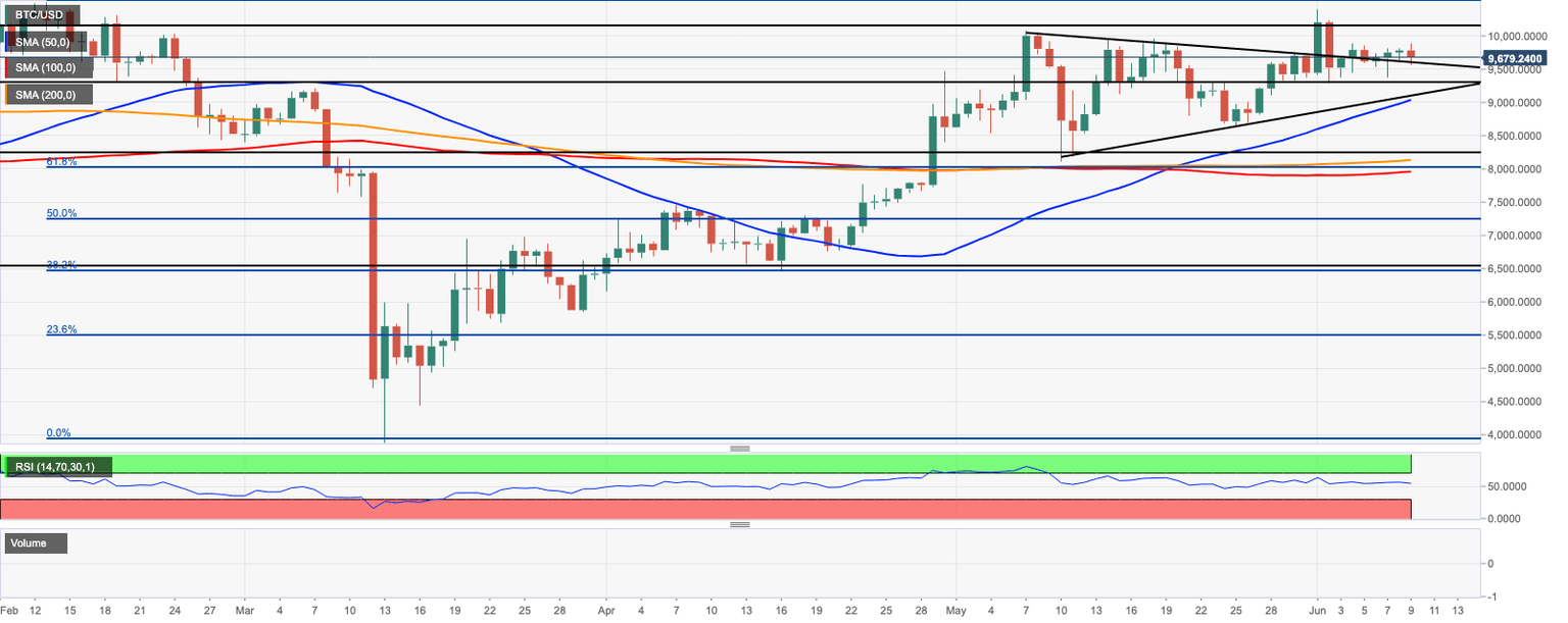 On the weekly charts, the price has created two Doji candles, which can be interpreted as a signal of market uncertainty. On a daiyl chart, BTC/USD moved outside the triangle pattern. Now the price is moving along the upper line of the triangle now at $9,600 amid lack of upside momentum. If the coin return inside the pattern, the downside momentum may gain traction and take the price to $9,000. THis psychological barrier is reinforced by daily SMA50, and it separates us from a deeper decline towards $8,000 with daily SMA100 and SMA200 clustered around this barrier.