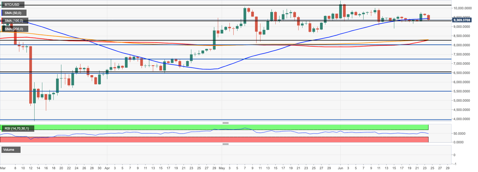 At the time of writing, BTC/USD is hovering below $9,400, down 2.6% since the start of the day. The coin touched the recent high of $9,700 on Monday, June 22, but failed to hold the ground and retreated to $9,294 ahead of the US opening, amid the sell-off on the global stock markets. Despite the recovery, BTC/USD is still moving with a short-term bearish bias amid low volatility.