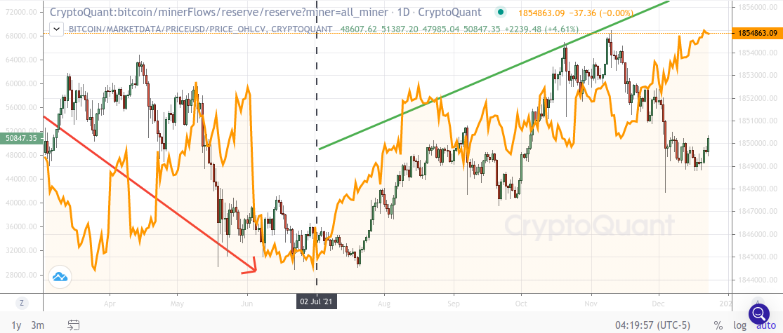 Bitcoin miner reserve vs. BTC/USD annotated chart. Source: CryptoQuant