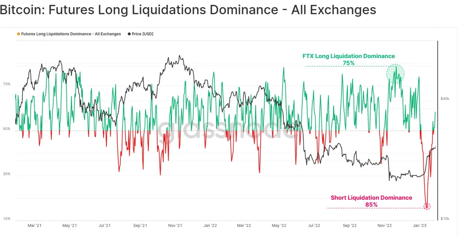 Futures data typically hold an equilibrium between longs and shorts. As the market moves, investors tend to update their futures to avoid liquidation. Conversely, in mid-January investors were caught off guard which resulted in an all-time high of 85% short liquidations.