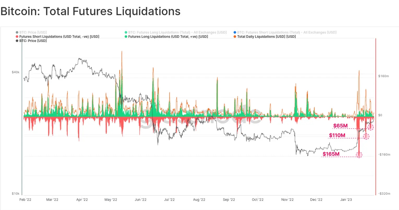 The short liquidation dominance has helped fuel the current Bitcoin rally. In January 2023, over $495 million in short futures were liquidated. Liquidated shorts create automatic Bitcoin purchases thus driving up the BTC price. The year-to-date liquidations have three large waves that peaked at $165 million in one day of liquidations.