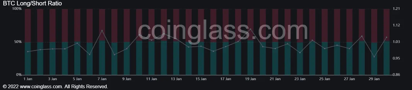 After the historic amount of short liquidations, the futures market is trending towards longs. On Jan. 30, 51.46% of open interests are long positions rather than shorts.