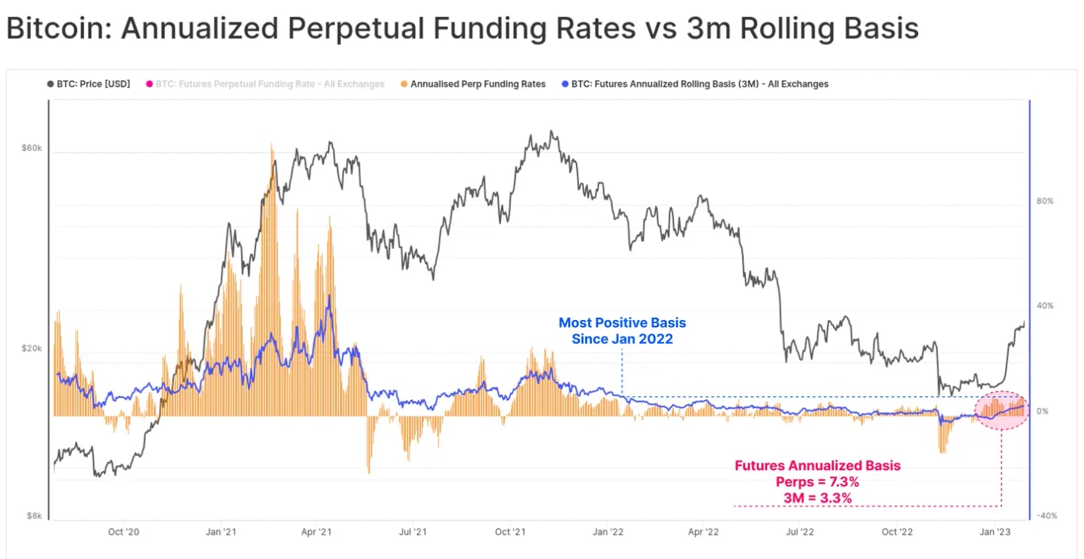 "Across both perpetual swap, and calendar futures, the cash and carry basis is now back into positive territory, yielding 7.3% and 3.3% annualized, respectively. This comes after much of November and December saw backwardation across all futures markets, and suggests a return of positive sentiment, and perhaps with a side of speculation."