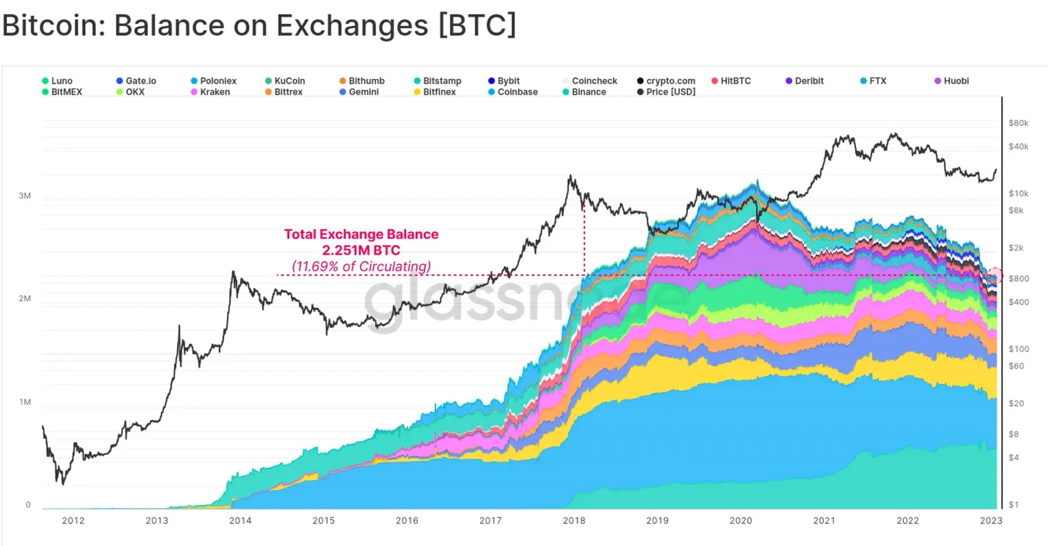 In March 2020 centralized exchange (CEX) Bitcoin balances reached an all-time high. Since the all-time high was reached, Bitcoin has flowed out of spot exchanges. Approximately 2.25 million BTC are currently held across 21 of the top exchanges, which is a multi-year low. The 11.7% of the total Bitcoin supply held on centralized exchanges was last witnessed in February 2018.