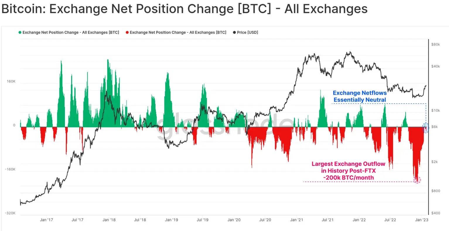 Typically throughout Bitcoin’s history, exchange inflows and outflows are similar creating an even balance. The balance was disrupted in November 2022 when net outflows of Bitcoin from exchanges reached $200 million to $300 million per day. The large outflow during this period was historic, reaching negative 200,000 Bitcoin leaving exchanges for the month.