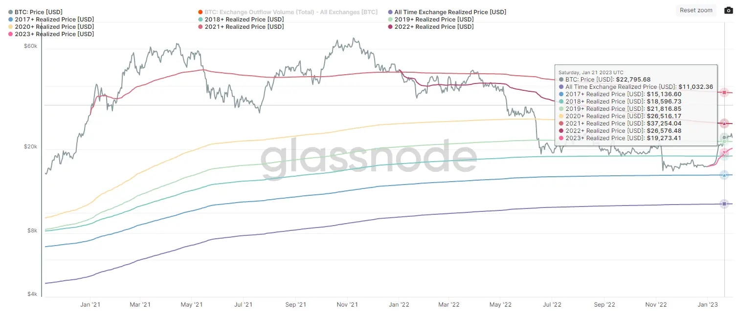 Bitcoin’s movement in and out of exchanges helps provide analysts an estimate for investors’ BTC acquisition price. During the 2022 bear market, only investors from before 2017 were in potential profit. Investors arriving to Bitcoin after 2018 were all at an unrealized loss.