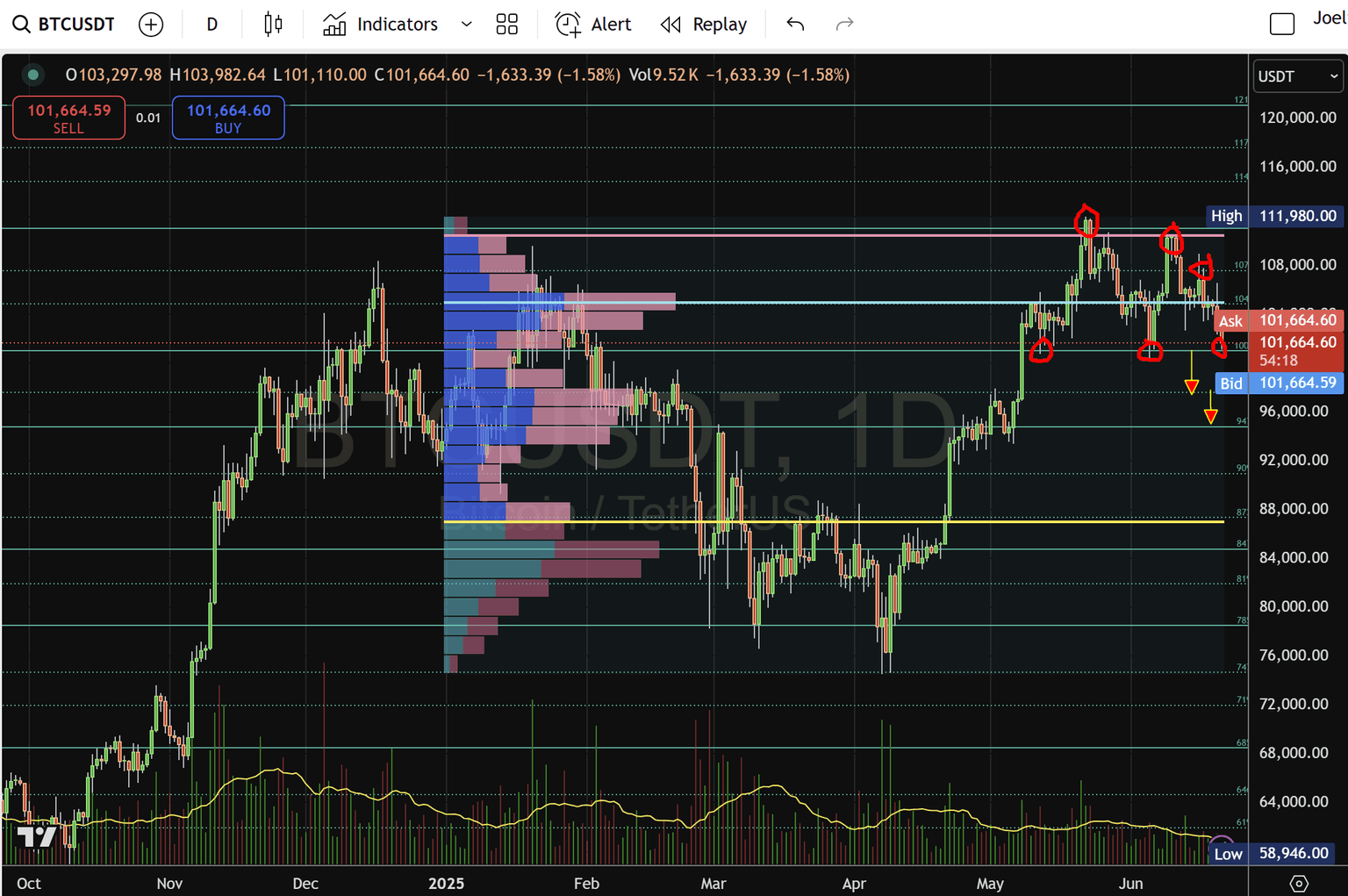 On the daily timeframe, BTC/USDT is trading around $101,622, down roughly 2% from recent highs. The pair has relinquished its Volume Profile Point of Control (POC) at $104,825, signalling that the distribution of traded volume is shifting lower.