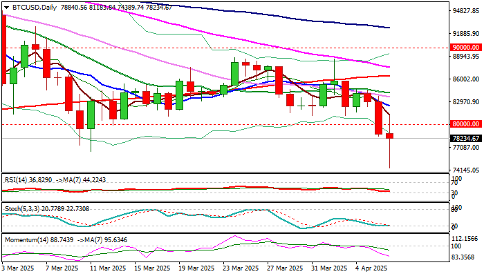 Fresh strength cracked psychological 80K resistance, but firm break higher is required to offset negative signal from last week’s close below this level.