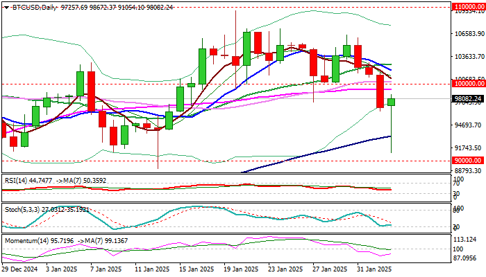 Renewed pressure on 90K breakpoint made traders more cautious despite the price bouncing strongly after hitting new low on Monday (91054) with the downside expected to remain vulnerable as long as the price stays below 100K, as daily studies are bearishly aligned (daily Tenkan/Kijun-sen bears-cross / negative momentum.